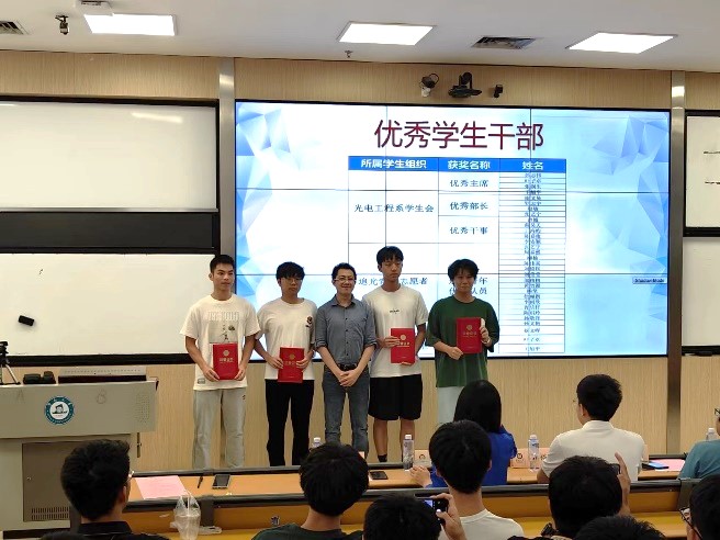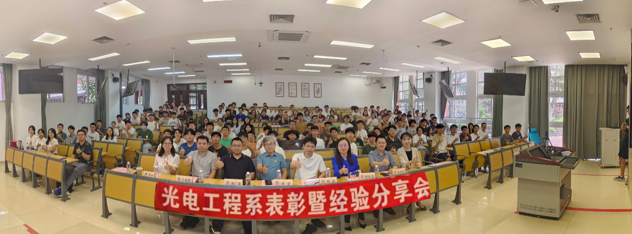 11月6日,成人vr 光电工程系2022-2023学年表彰大会在富力教学楼124课室召开。本次大会为荣获国家级和省部级等各类奖项、荣誉称号,以及在科研论文发表等方面表现突出的学生代表们颁奖。学院党委书记黄睿、广东九安智能科技股份有限公司智能嵌入式开发经理李广强校友及无线技术经理韩裕校友、光电工程系主任卢惠辉、党总支书记曾庆慧、副系主任朱思祁、辅导员李仕萍、马悦及全体2023级新生参加大会。会议由马悦主持,广东九安智能科技股份有限公司提供赞助。