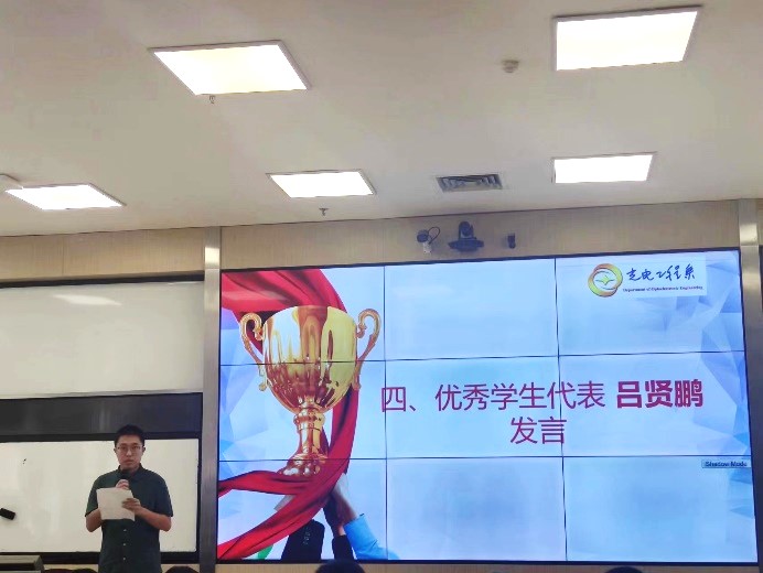 2020级吕贤鹏代表受表彰同学发言。他首先感谢学院和光电工程系对自己的培养,鼓励学弟学妹们要练就过硬本领,在理论与实践的交叉融合中努力学习,要锤炼坚韧不拔的意志,追光而行,全面发展。