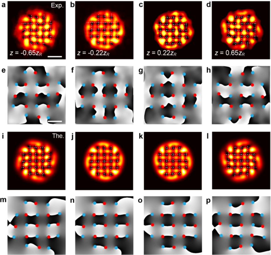 图 2:涡旋-反涡旋晶格(含5x5个单元)稳定传播。不同传播距离下实验观测的光强分布(a-d)和相位分布(e-h)。实验结果与理论预测结果(i-p)保持一致。