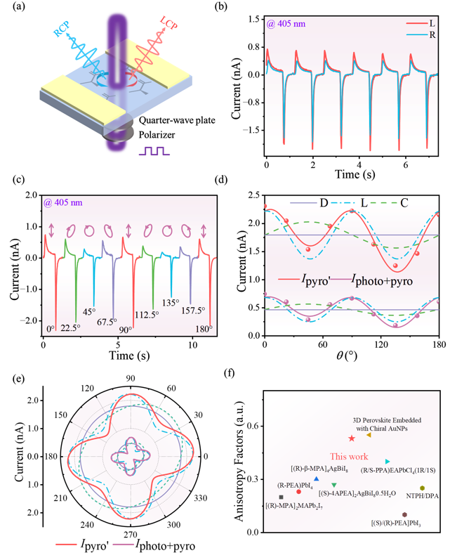 手性光探测器是目前科研热点和难点,集成化的左右旋光识别器件对于生物结构探测、光通信、量子光学计算等领域有着极大的应用价值。目前的手性探测器备选方案少、实现难度大,且手性探测方案局限于手性钙钛矿、人工微结构以及有机异质结等体系。基于团队前期在偏振探测领域的积累(Laser & Photonics Reviews, 2023, 2300286,封面论文;Research, 2023; 6: 0199),研究团队首次对热释电晶体DLATGS(氘化L-丙氨酸掺杂硫酸三甘肽)进行了手性方面的研究,发现晶体内部手性结构以及其对旋光的敏感性,通过将晶体器件化并探索光电响应特性,表征出了其明显的四阶段型热释电-体光伏耦合响应。由于体光伏效应本身的载流子分离机制与光的电矢量方向密切相关,通过结合线性体光伏理论(LBPV)和圆形体光伏理论(CBPV),能够实现同时对左右旋光以及不同的偏振态进行检测,器件同时表现出了不俗的性能,能够达到3.86的偏振比和0.52的各项异性因子,领先于大多数的同类器件。