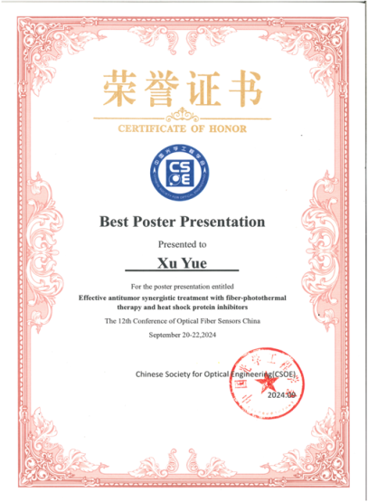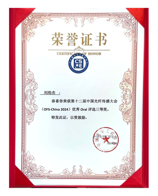 此次会议颁发了第一届光纤传感优秀青年人才奖,学院关柏鸥团队冉洋研究员是全国6位获奖者之一。
