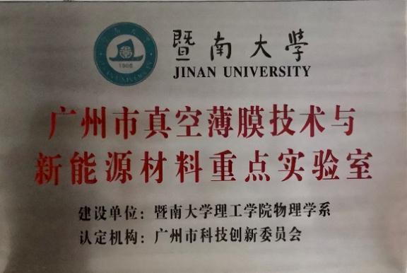 2016年,物理学系申报的广州市真空薄膜技术与新能源材料重点实验室获得立项,获批经费200万元;2018年,物理学系联合真空学会部分企业会员单位成立了广东省真空薄膜技术与新能源材料工程技术研究中心。