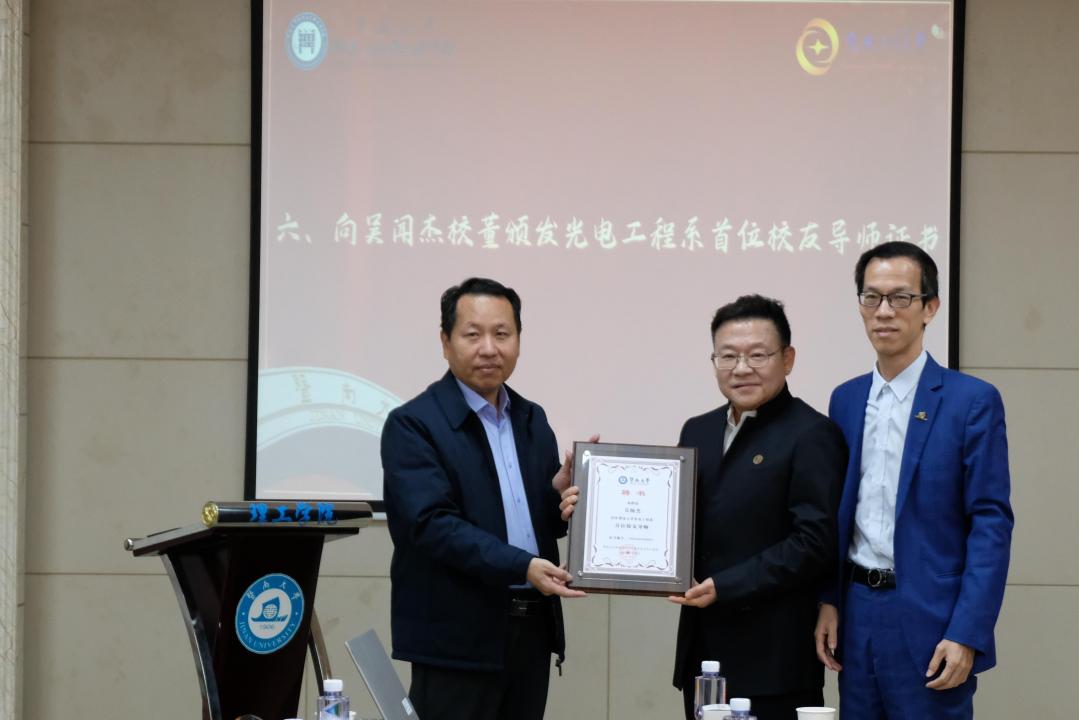 光电工程系敦聘吴闻杰校董作为首位校友导师。光电工程系导师代表陈振强教授和周治为吴闻杰校董颁发导师聘书,优秀学生代表李雨欣向吴闻杰校董献上鲜花。