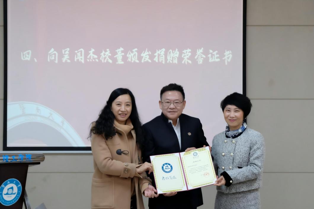 梁燕、刘毓洁向吴闻杰校董颁发捐赠证书