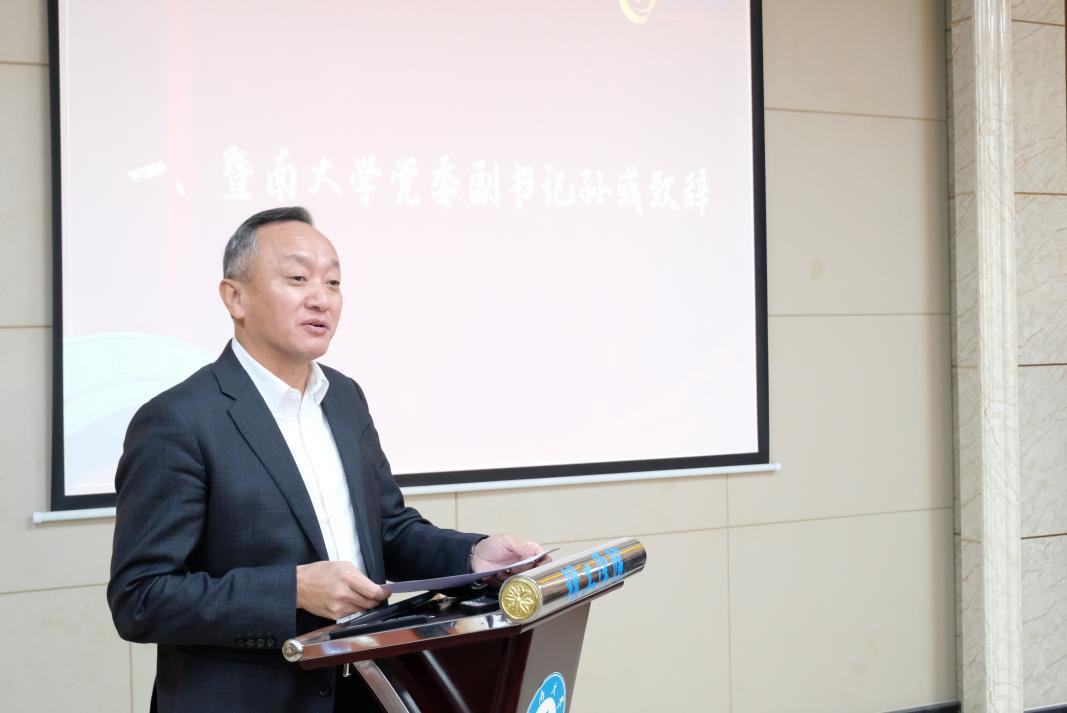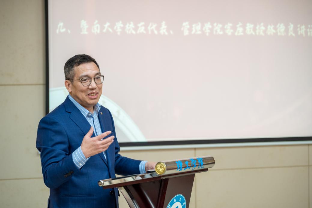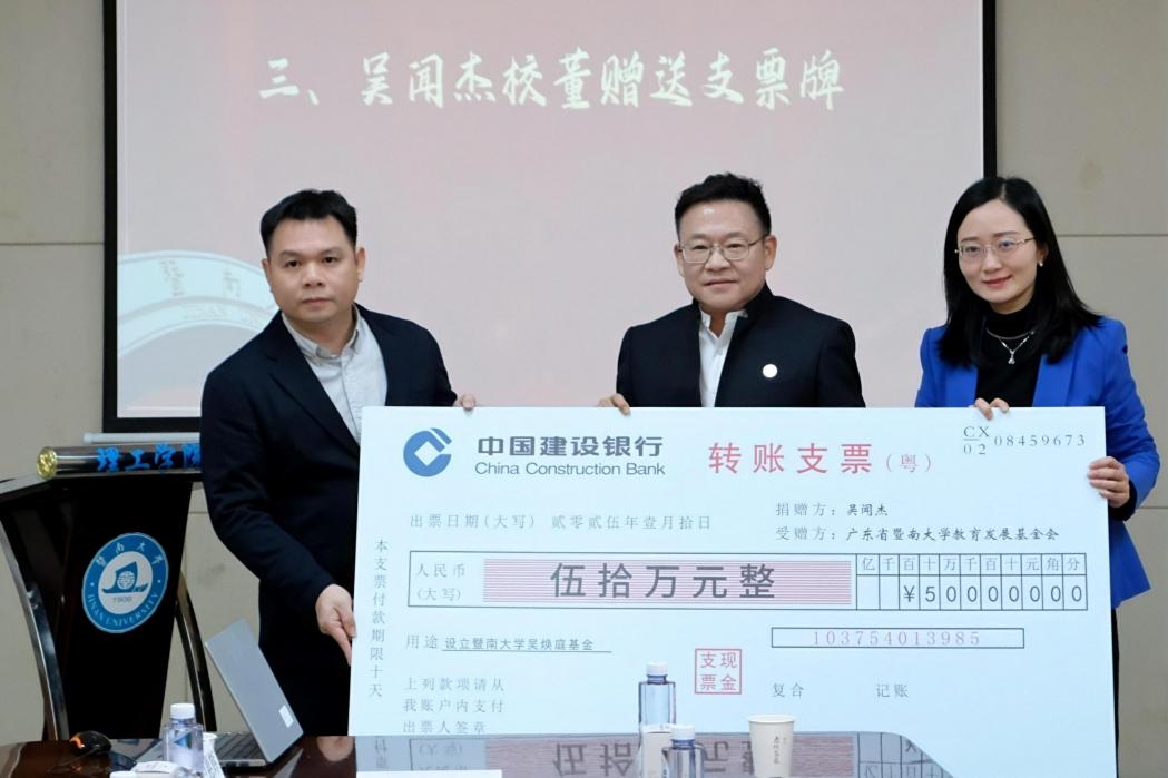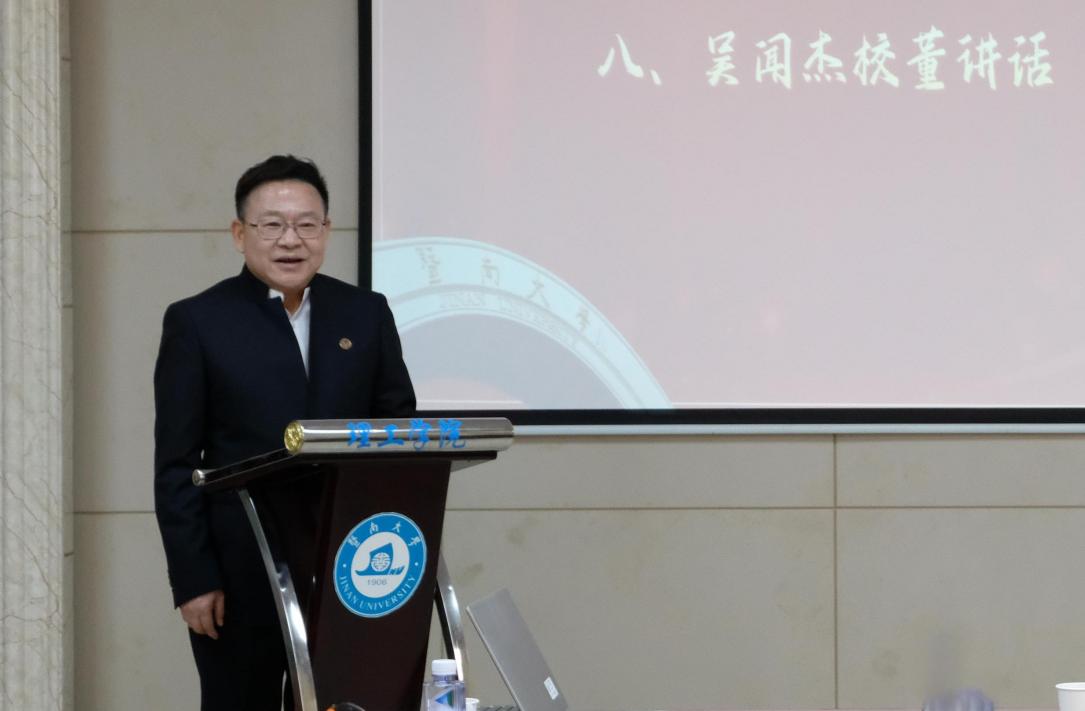 仪式上,吴闻杰校董感谢学校领导长期以来对校友工作的关心和支持,并深情回忆了40多年前在暨南园就读本科时的光阴岁月。吴闻杰校董谈到,“滴水之恩,当涌泉相报”,秉承“忠信笃敬”的暨南校训和父亲尊师重教的教诲,捐资设立吴焕庭基金,旨在表彰光电工程系在学术科技创新领域取得杰出成就的学生及其指导教师,激发更多青年才俊勇攀科学高峰。他勉励师弟师妹们勤奋学习,成长为对社会、对国家、对人民有贡献的栋梁之才。
