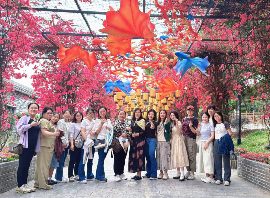 为庆祝第115个“三八”国际妇女节,传承和弘扬中华优秀传统文化,进一步丰富女教职工的文化生活,3月13日,成人vr 工会组织女教师前往广州岭南印象园开展“指尖生花 芳华绽放”掐丝珐琅非遗体验活动。学院党委副书记、女工委主任孙玉环,学院副院长、工会主席郭团,光电工程系党总支书记曾庆慧,党政办主任、工会副主席厉明带领女教师代表近40人参加活动。