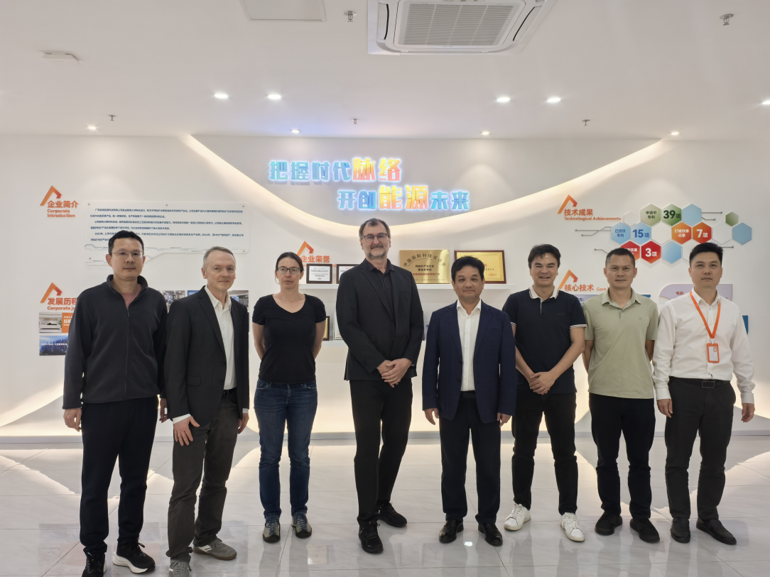 学术交流结束后,Christoph Brabec教授、香港城市大学叶轩立教授一行参观了位于珠海香洲区的广东脉络能源科技有限公司的兆瓦级产线。麦耀华向Christoph Brabec教授一行介绍了公司的发展历程,并展示了公司近期开发的大面积钙钛矿光伏板以及商业化柔性光伏组件。