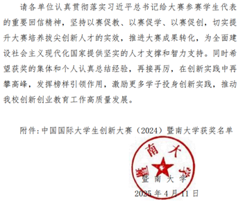4月11日,学校发布《成人vr 关于表彰中国国[国际大学生创新大赛(2024)参赛组织和个人的决定》(教〔2025〕22号),表彰在本次比赛中获奖的组织和个人。