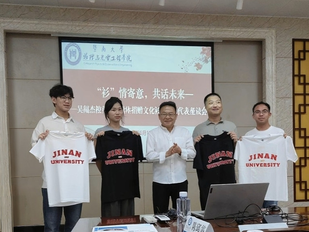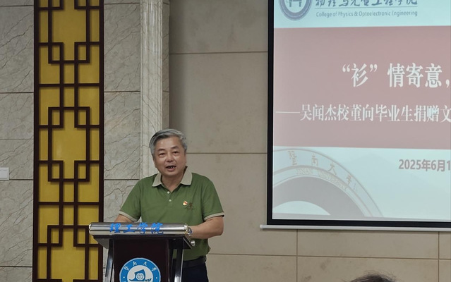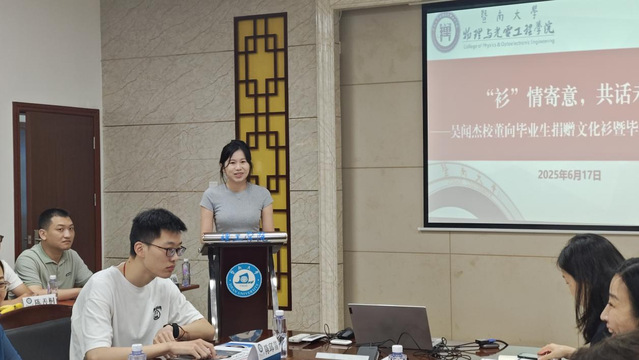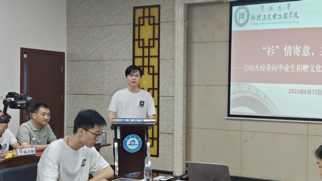 光电工程系本科生田子平分享了自己逆风翻盘的奋斗经历,面对复杂的课程和学业压力,及时调整学习方法,实现绩点排名从第69名到第六名的跃升,并发表三篇SCI论文,申请了一项发明专利,最终保研南开大学。她表示吴闻杰师兄捐赠的文化衫,承载着对毕业生的殷切期望和深深祝福,将成为她暨南记忆中一抹温暖而独特的色彩。