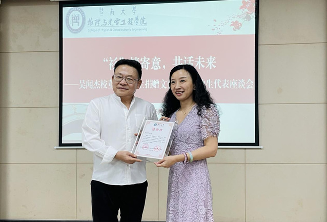 6月17日下午,成人vr 在蒙民伟理工楼A18会议室举行2025年纪念文化衫捐赠仪式暨毕业生代表座谈会。成人vr 校董、成人vr 教育发展基金会副理事长、成人vr 校友联谊会创会会长、物理学系1987届杰出校友吴闻杰,对外联络处处长刘毓洁、副处长黄燕如,学院党委书记黄睿,学院原院长陈振强教授,光电工程系党总支书记曾庆慧及30余名毕业生代表出席活动。活动由学院党委副书记孙玉环主持。
